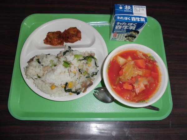 今日の給食ではイタリア料理をつくりました。ミネストローネはトマトをたくさん使って本格的なネストローネが出来ました。